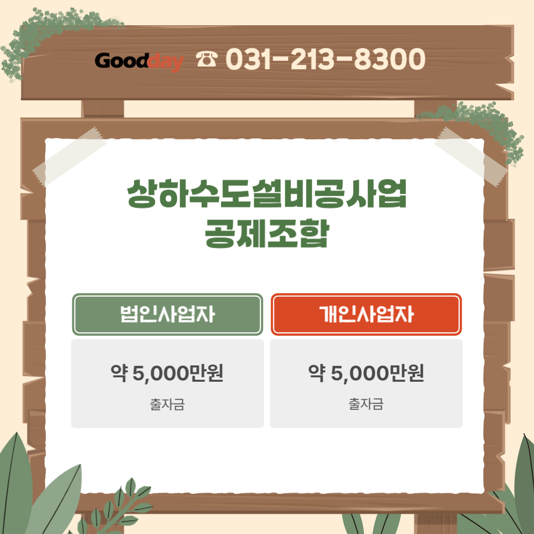 상하수도설비공사업 면허 취득을 위해서는 공제조합 출자금을 약 5천만원 확보해야 합니다.